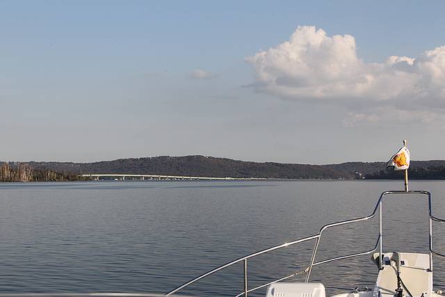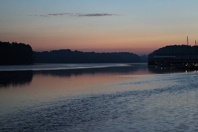 We got an early start and set our travel all the way to Guntersville about 85 miles. Just before the Guntersville lock we came across a beautiful bluff named “Painted Bluff”. We had about a two hour delay at the lock waiting on a large tow so we were close to sunset getting into the town dock at Guntersville. We were meet at the dock by Jeff a friend of Skip Binkley, Jeff had purchased Skips previous American Tug and had just seen the picture of Jackets II that Fay had sent Skip that morning in Florence, Small World. Jeff is planning on doing the loop in a year or so. A few hours later Jan from “CBAY” stopped by with some of her family. Someone had seen Jackets II and recognized it from her blog. Rusty and Jan had completed the loop a few weeks ago.  It was great to see her, we may see them on the way back from Chattanooga.